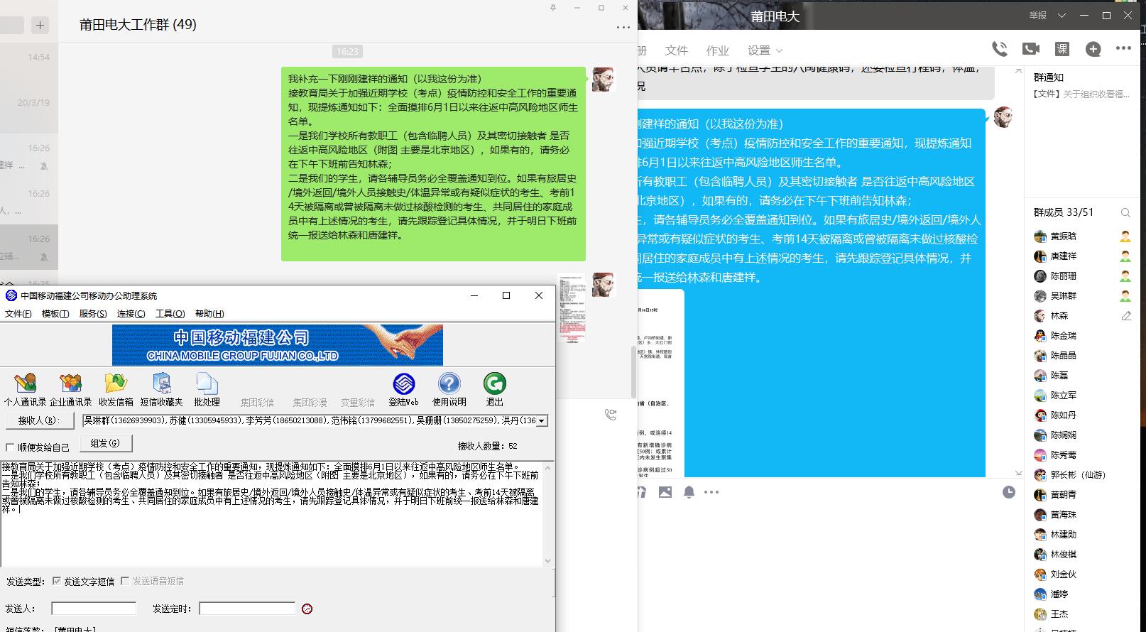 “接教育局关于加强近期学校(考点)疫情防控和安全工作的重要通知,现提炼通知如下:全面摸排6月1日以来往返中高风险地区师生名单。 1、我们学校所有教职工(包含临聘人员)及其密切接触者 是否往返中高风险地区(附图 主要是北京地区),如果有的,请务必在下午下班前告知林森; 2、我们的学生,请各辅导员务必全覆盖通知到位。如果有旅居史/境外返回/境外人员接触史/体温异常或有疑似症状的考生、考前14天被隔离或曾被隔离未做过核酸检测的考生、共同居住的家庭成员中有上述情况的考生,请先跟踪登记具体情况,并于明日下班前统一报送给林森和唐建祥。”