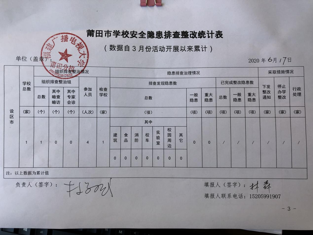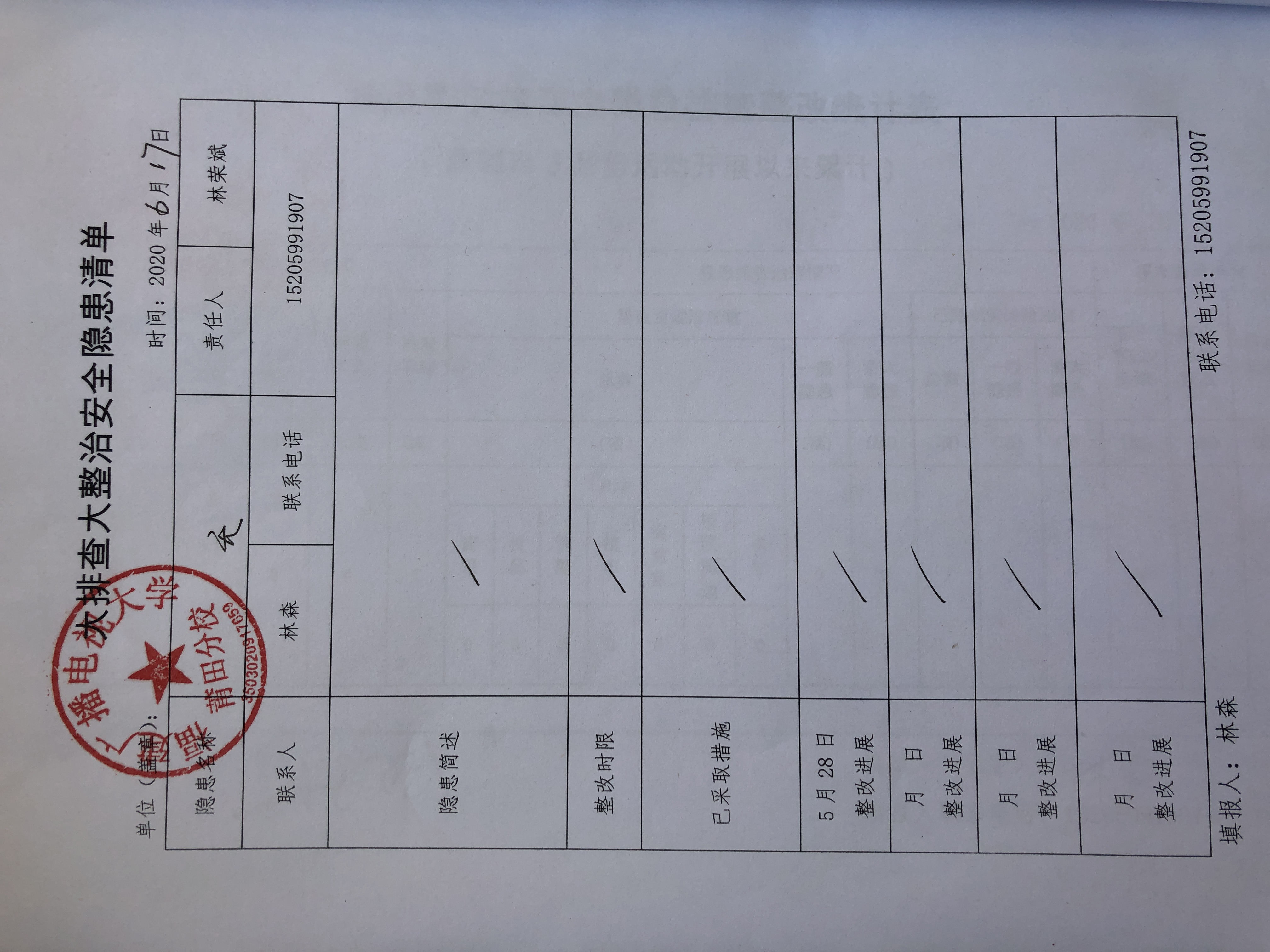 做好安全隐患排查整治工作。虽然我校所处地势平坦地区,且新校区使用不足2年,但这丝毫没有降低我校对安全隐患排查工作的警惕性、积极性、重视性。我校林森老师每周按市教育局的要求规定对电大办公楼进行巡查,并上报《莆田市学校安全隐患排查整改统计表》及《大排查大整治安全隐患清单》