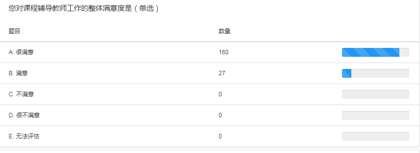 1、毕业生个人对莆田电大辅导教师工作整体满意度评价高,很满意160人,满意27人。
