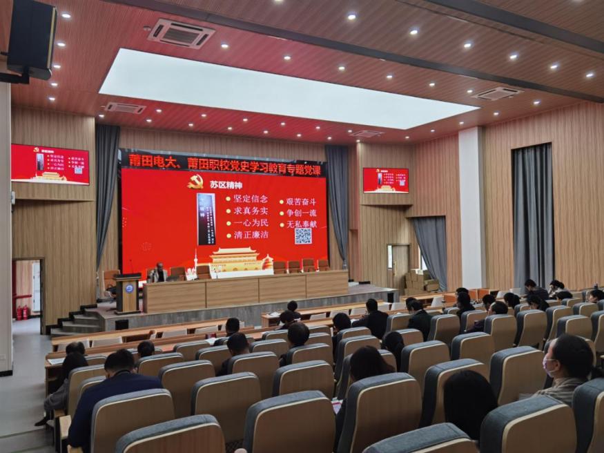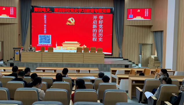 今年是中国共产党建党100周年。为深入学习贯彻习近平总书记在党史学习教育动员大会上的重要讲话精神,推动党史学习教育走深走实,引导全体教职工学习党史悟初心,奋勇争先开新局。2021年3月26日,福建广播电视大学莆田分校开展党史学习教育专题党课,本次党课由校党委书记林荣斌主持,郑宗太副教授进行专题讲授,电大全体教职工及职校全体党员参与了本次专题党课。