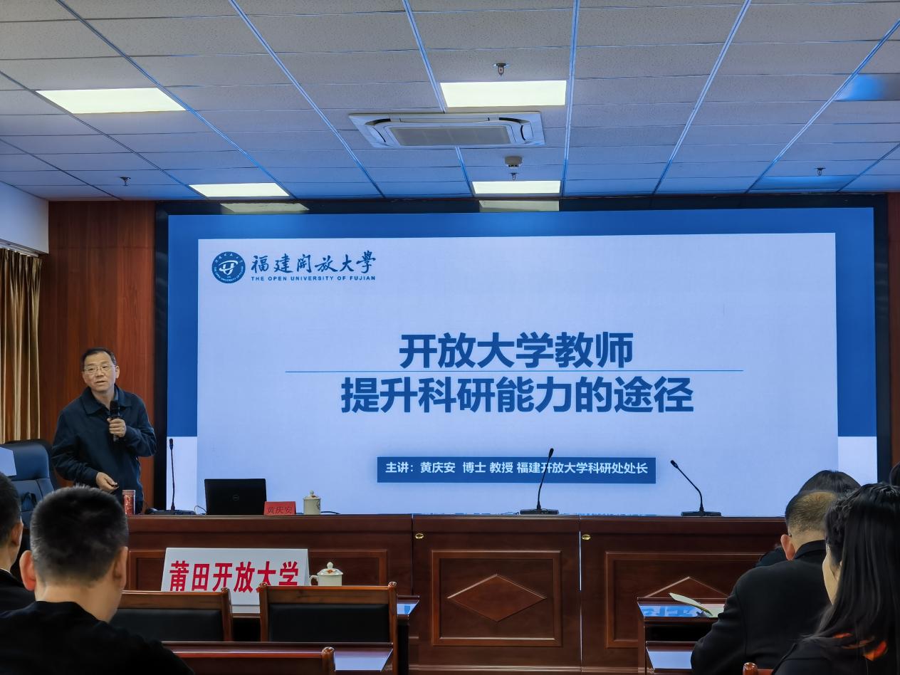 为了提升莆田开放大学内涵建设和服务能力,4月12日下午,莆田开放大学举行《提升莆田开放大学教师科研能力的途径》的讲座。讲座由莆田开放大学副校长凌文东主持,福建开放大学教学科研教处教授、管理学博士、科研处处长黄庆安主讲,莆田开放大学教职工30多人参加讲座。