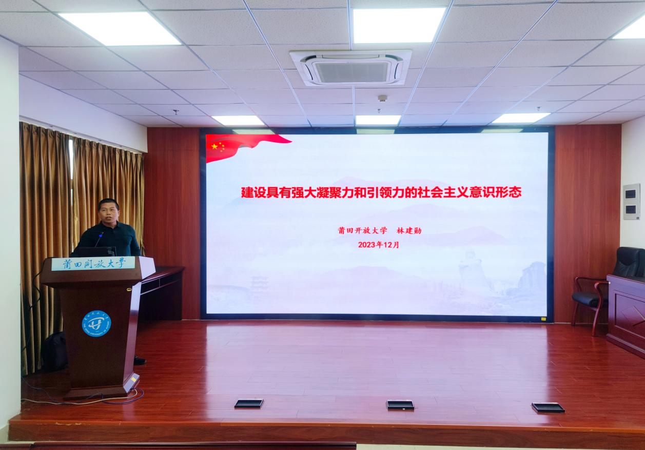 12月5日,莆田开放大学学习贯彻习近平新时代中国特色社会主义思想主题教育第三次读书班系列专题讲座继续开讲,莆田开放大学党委纪检委员林建勋作《建设具有强大凝聚力和引领力的社会主义意识形态》专题讲座,莆田开放大学和莆田职业技术学校全体党员教师参加。