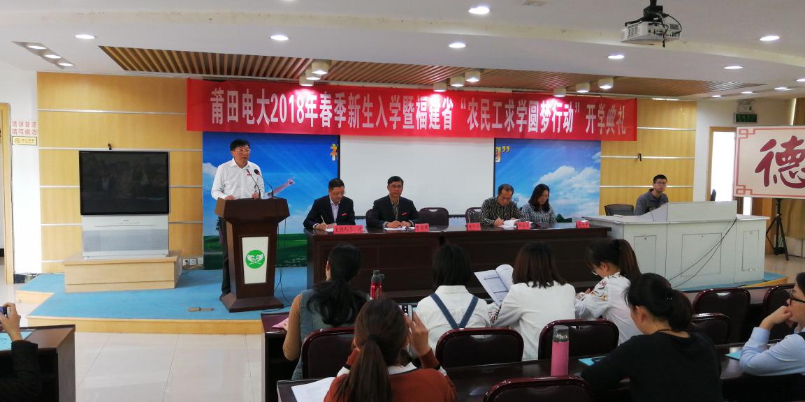 2018年3月31日上午,莆田电大举行2018年春季新生入学暨福建省“农民工求学圆梦行动”开学典礼。陈仁川校长、郑宗太副校长、苏健副书记,相关处室负责人、2018年春季开放教育专业组织员以及200多名新学员参加了开学典礼。